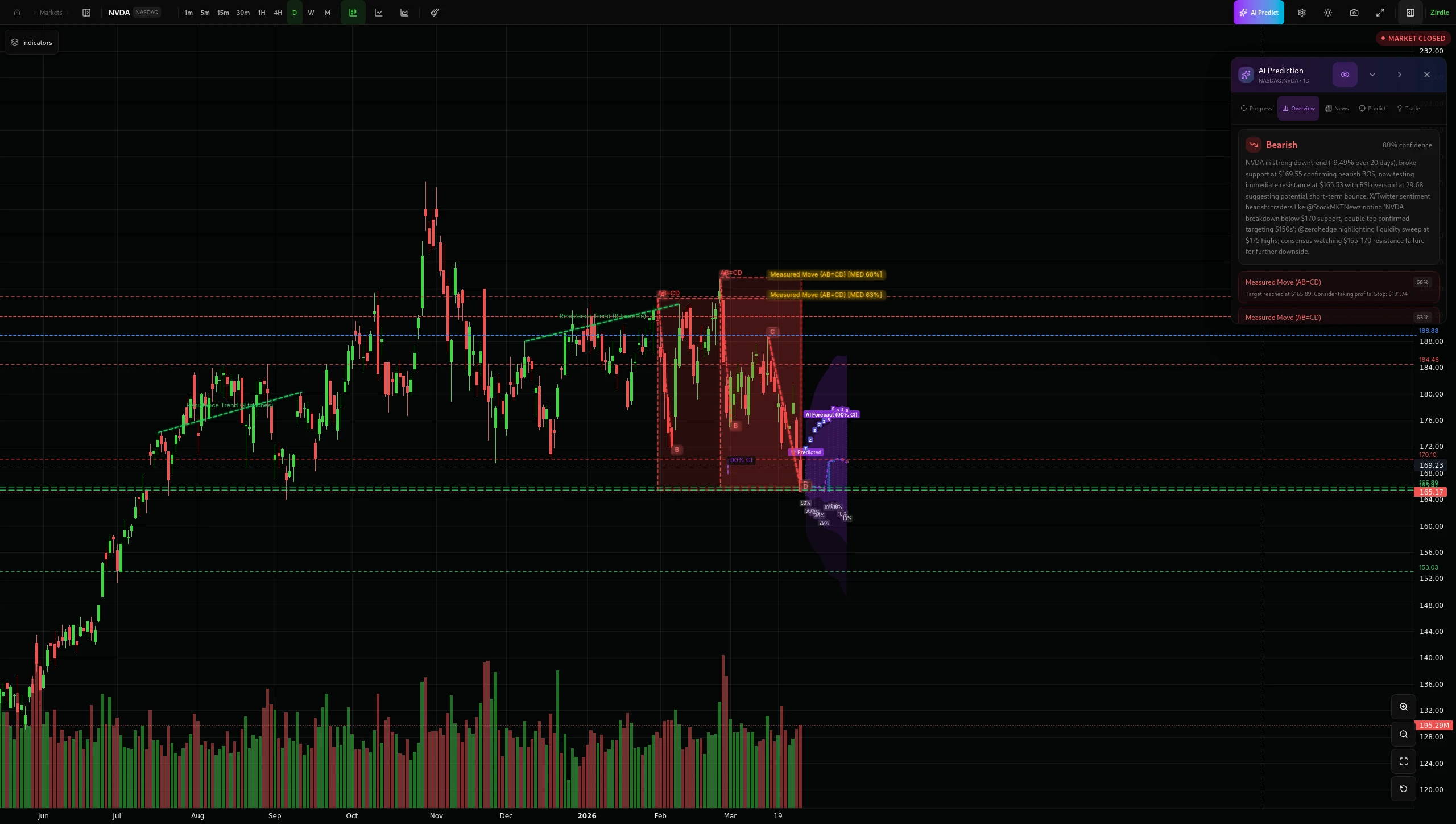 我们的AI实时扫描图表——识别22种以上模式,绘制支撑和阻力线,并在几秒钟内生成预测